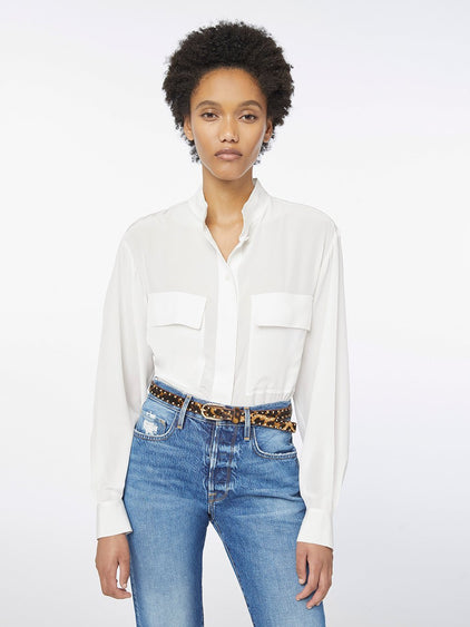 A utilitarian take on our clean collared shirt, this off-white button-down features large flap pockets and voluminous sleeves. Layer yours under this season’s leather trench coat for a modern safari vibe.