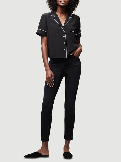 $200$219Ultra High Rise Skinny Jean With A Shorter Inseam. Crafted From Super Stretch Premium Denim In A Soft Black Wash. Cigarette Fit Through Leg To Hem.