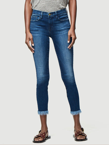 | A Cropped, Mid-Rise Skinny Jean That Sits Lower In The Front And Higher In The Back. Cut From Ultra-Soft, Super-Stretch Denim, This True-Blue Pair Features Slight Fade And Whisker Detailing With Shredded Hems. |
