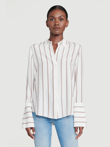 This striped blouse is reimagined with exaggerated cuffs and a multi-directional stripe. Break the boudoir tone by pairing with rigid denim for a result that's both effortless and smart.