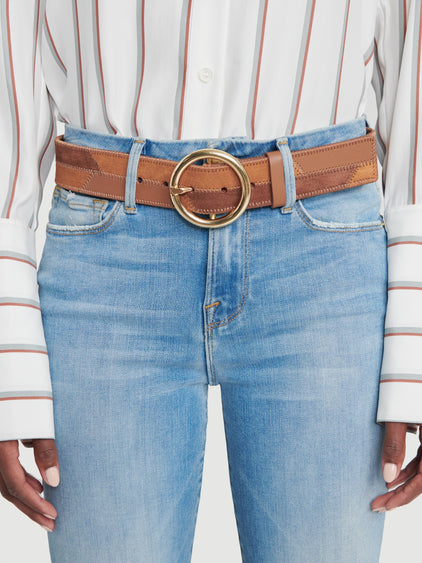 This patchwork leather belt is a fresh addition to your accessories collection, featuring a circular buckle in polished gold. A retro finish to denim, dresses, pants, and skirts.