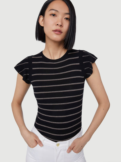 Sweet flutter sleeves put a decidedly feminine spin on the striped sweater. Finely ribbed for a slim fit, tuck yours into high waisted jeans, skirts, and trousers for a flattering shape.